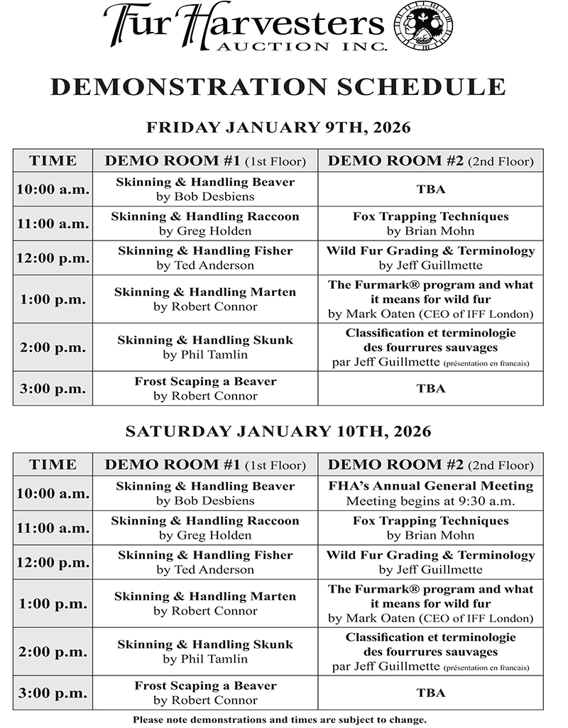 The various demonstrations we organise are one of the main attraction to our Annual Trappers Convention, and are often performed by the industrie's best trappers and pelt handlers. There will be two demos rooms, running both Friday and Saturday from 10:00 am to 4:00 pm. Do not miss out on these very informative presentations.